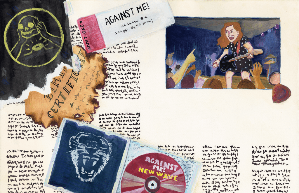 A full-spread biographical illustration of Laura Jane Grace, lead singer of Against Me! The main image shows Grace the night she burned her birth certificate onstage to protest North Carolina’s “bathroom bill” in 2016. Gouache, watercolour, pencil crayon on paper, 2022.