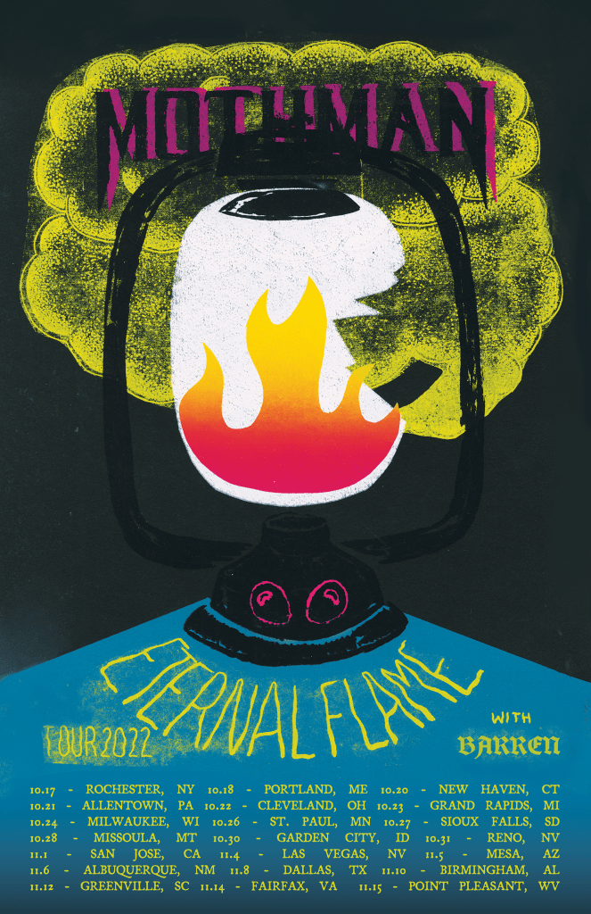 Mothman is the most ethereal and strange of the cryptids, so this pairing just felt right. Industrial goth is gritty and experimental, which is emulated in the album cover’s layered images and textures. The main photo is an aerial view of Mothman’s origin place, the West Virginia Ordinance Works. The poster is more straightforward, a tongue-in-cheek screen print of a broken lantern – my very first exploration into this series.